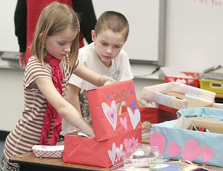 First-graders Cassie Peacock and Thor Smith read Valentine cards from their boxes during the party.