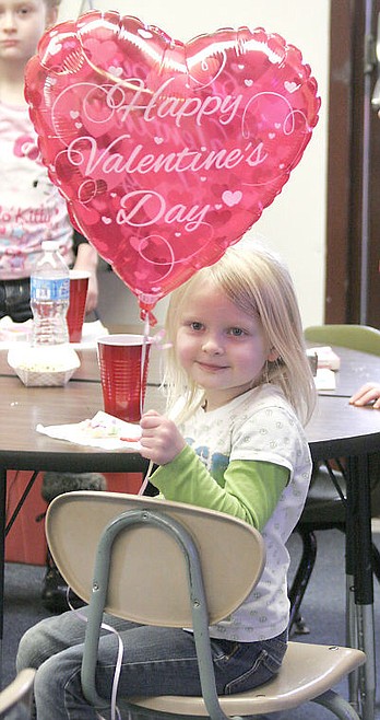 Taylor Faner, 4, holds her Valentine balloon while visiting her sister's kindergarten class.