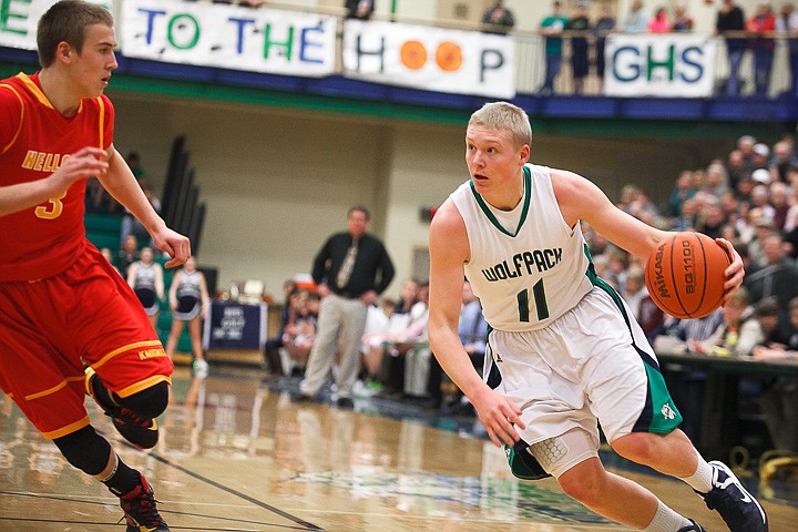 Glacier junior forward Bryan Michaels (11) drives to the hoop Friday night during Glacier's home victory over Hellgate. Friday, Feb. 22, 2013 in Kalispell, Montana. (Patrick Cote/Daily Inter Lake)