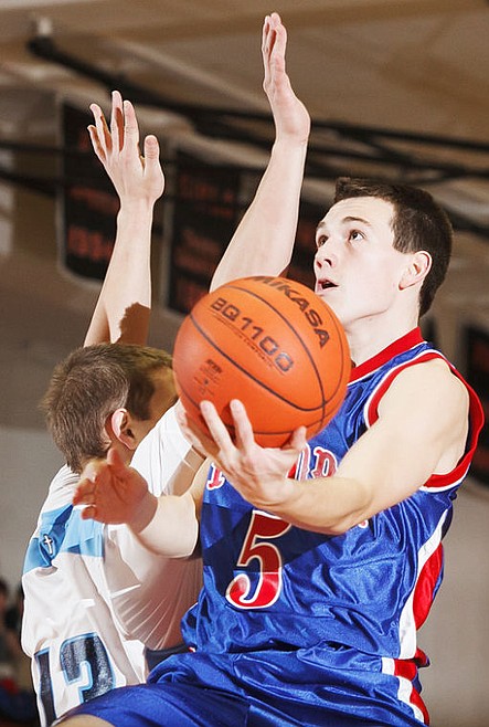 Bigfork senior Seth Roessmann (5) lays the ball up past a Loyola defender Friday afternoon during the Vikings' win over Loyola in a semifinal game of the Western B Divisional Tournament at Flathead High School. Friday, Feb. 22, 2013 in Kalispell, Montana. (Patrick Cote/Daily Inter Lake)