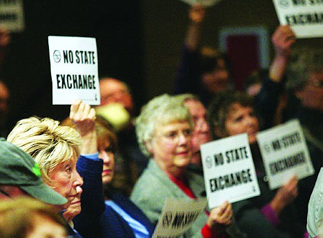 Rob Moser, who lives in Post Falls, handed out signs against the state exchange before the two-hour meeting, which the audience waved at times.