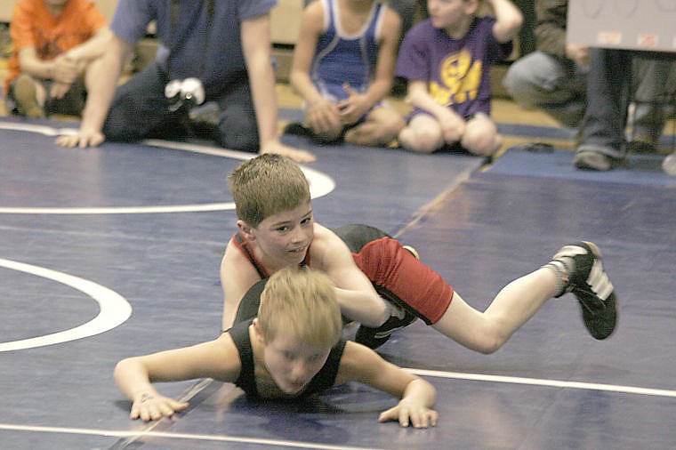 A Hot Springs grappler hits the mat with a Polson wrestler.