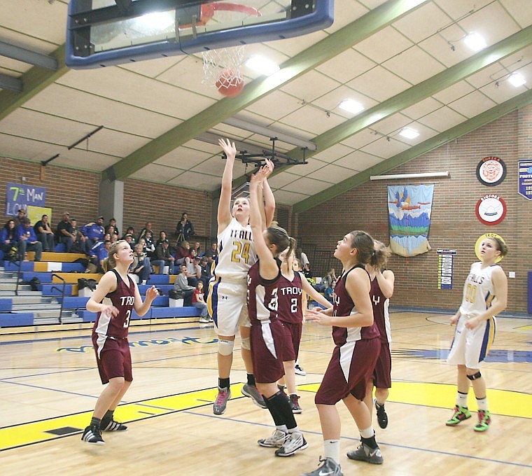 Logan Beckman take a shot against the Troy Lady Trojans on Dec. 21 at home. Beckman led the Lady Hawks in scoring for the game, posting 14 points total.