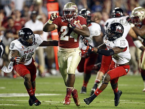 Desroy Maxwell took a short snap on a fake punt on fourth and 3 and ran 35 yards to set up a field goal for the Huskies' first score, but their offense struggled to sustain anything. Lynch passed, ran or punted on 28 of 29 plays for Northern Illinois' offense in the first half, and the Seminoles were geared to stop him.