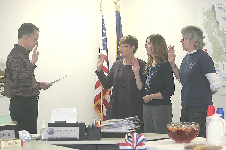 Sanders County Commissioner Tony Cox reads the ceremonial procedures for the swearing in of Carol Brooker, Candace Fisher and Beth Rice-Groshong on Dec. 27 at the Sanders County Commissioners conference room in Thompson Falls.
