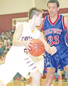 Junior guard Nathan Olds drives past Bigfork's Christian Evans to score in fourth quarter.