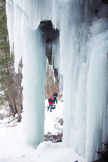 Chris Rost, left, and Lara Middlemas prepare for a climb Tuesday afternoon at an ice wall near US 2 just outside of Hungry Horse. Tuesday, Jan. 8, 2013 in Hungry Horse, Montana. (Patrick Cote/Daily Inter Lake)