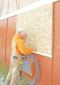 Employees from McNew’s Glass and Home Supply were putting plywood on the windows of the hotel Monday.
