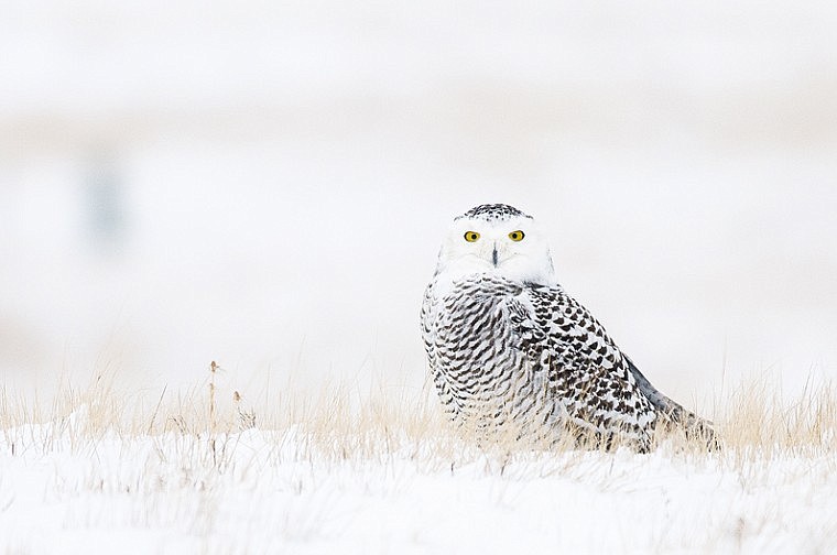 A snowy owl sits in a field near Polson.