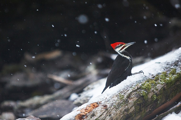 A pileated woodpecker perches on a fallen tree Tuesday afternoon outside of Hungry Horse. Tuesday, Jan. 8, 2013 in Hungry Horse, Montana. (Patrick Cote/Daily Inter Lake)