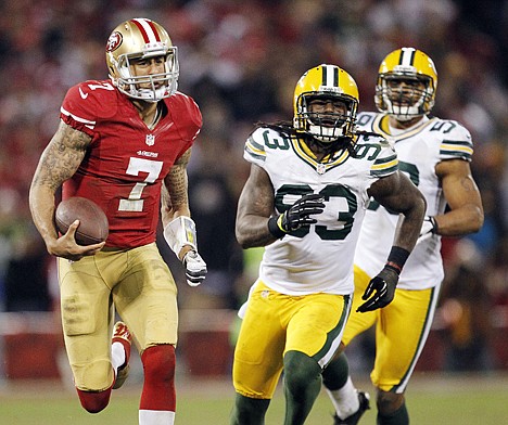 The strong-armed Kaepernick brushed off the interception he tossed on the fourth play of the game that Sam Shields ran back 52 yards for a touchdown, then took control with his pinpoint passing to his favorite go-to guy - Crabtree - and with his quick-burst ability out of the pocket.
