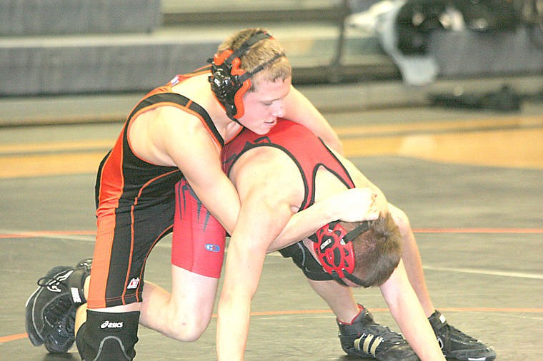 Dusten Henning takes down a Noxon kiddo at the Plains Quad tourney on Thursday.