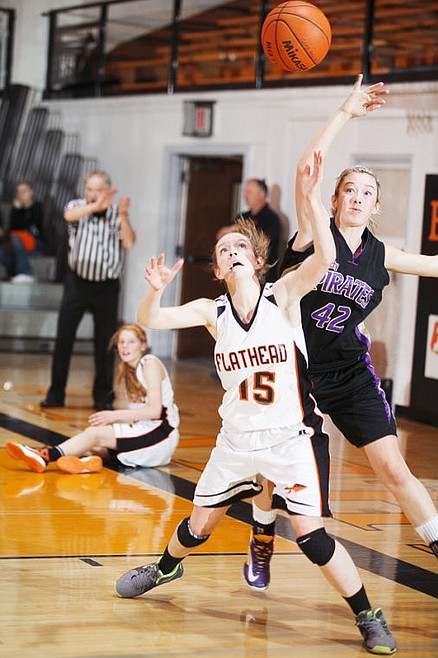 Flathead's Emily Russell (15) battles Polson's Monika Frame (42) for a loose ball Thursday night during the Bravettes' home victory over Polson. Thursday, Jan. 17, 2013 in Kalispell, Montana. (Patrick Cote/Daily Inter Lake)