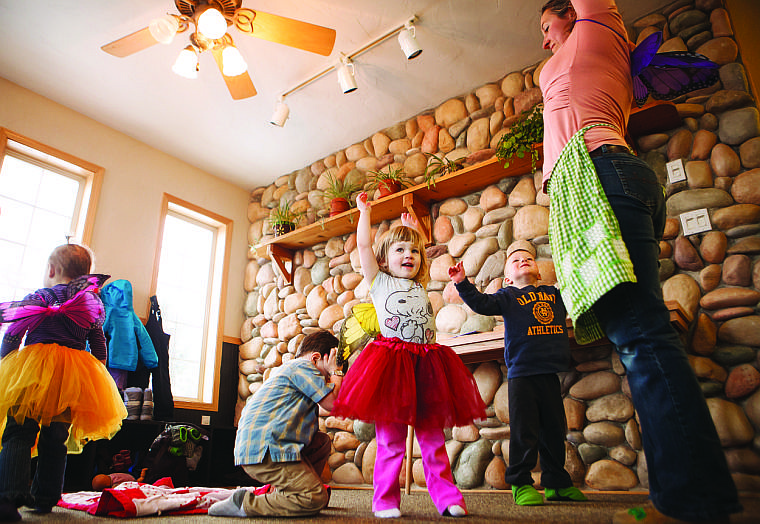 Oliva Walter, center, stretchs her arms up as Sara Walburg-Owens, right, leads yoga exercises for a group of two and three year olds Wednesday morning at Firefly Children's Center and Healing Arts in Kalispell.