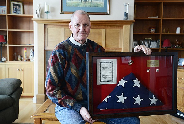 Retired Colonel Tom Sward of the United States Marine Corps in his home on Sunday, January 20, in Bigfork with a framed American flag that was presented to him on the day he took command of his battalion, First Marine Division. The flag is a cherished item in the Sward home because it flew over the U.S. Senate the day President Kennedy was assassinated. (Brenda Ahearn/Daily Inter Lake)