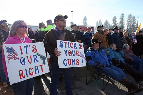 Bill and Kristie Kiley of Coeur d'Alene, each with a handgun holstered at their hips, held signs at the front row of the crowd.
