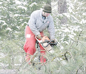 Cole Spencer limbs a recently felled pine tree Thursday afternoon as county crews clear an area for the new pistol range.