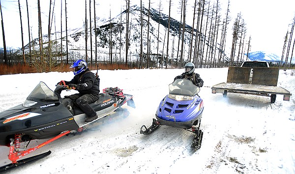 Randy and Cindy Helk of Kalispell set off for a bit of snowmobiling in the Flathead National Forest along the North Fork on Monday afternoon, January 21, north of Columbia Falls. (Brenda Ahearn/Daily Inter Lake)