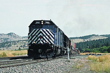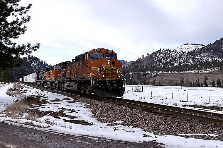 A Montana Rail Link freight train heads east through Mineral County. The MRL system consists of over 900 miles of track with 100 stations throughout Montana, including Superior.