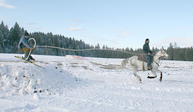 Jason Helvey rides his horse Blue while pulling skier Jerad Wilhelmsen through a series of jumps.