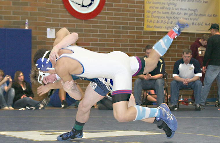 John Gunderson manhandles a Mission-Charlo wrestler during the tournament.