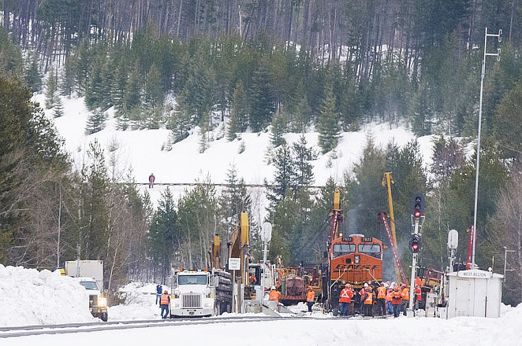 Burlington Northern Santa Fe crews rerail a locomotive that derailed early Friday morning. No fuel or product spilled from the cars during the derailment according to BNSF spokesman Gus Melonas. Friday, Jan. 25, 2013 in , Montana. (Patrick Cote/Daily Inter Lake)