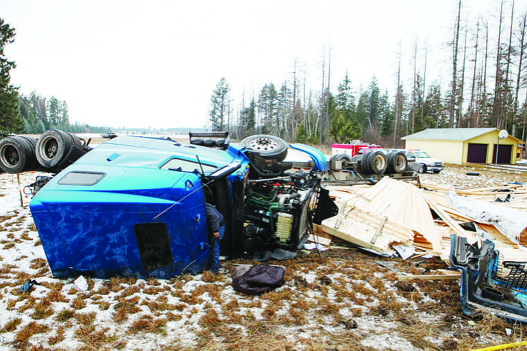 Lumber is scattered across a yard near mile marker 6 on Montana 206 after a semi-truck crashed when the driver fell asleep Friday afternoon. The driver walked away with no injuries.
