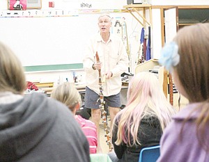Australian story teller Paul Taylor demonstrates the use of a lagerphone, a traditional percussion instrument.