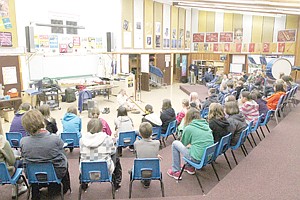 Forty-one sixth grade students were present Tuesday in Libby Elementary's music room for Paul Taylor's visit. When it was time for recess all present opted for a bit more time with the famed story teller from Australia.