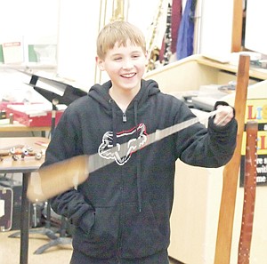 Proper use of the bullroarer, an ancient ritual musical instrument, is demonstrated by sixth grader Colton Howard Tuesday during Paul Taylor's visit to Libby Elementary.