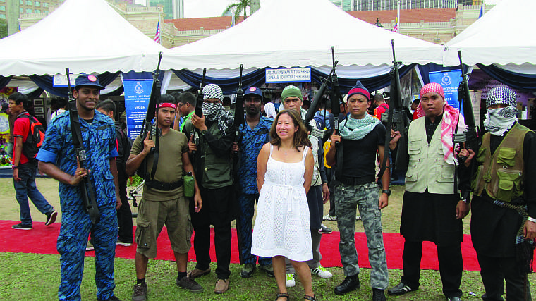 Laura Khor is pictured with officers of the Royal Malaysian Police Force who are members of Malaysia's elite counter-terrorism unit. They were dressed as terrorists as part of a community outreach program to Malaysians. "The underlying logic of Community Days is for people to approach them for pictures and/or information," Khor said. The officers then can explain what they do to keep Malaysia safe and which terror group they represent.