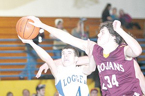 Libby guard Collin Johnson has his shot blocked by Troy’s Bruce Metz, but draws the foul from freshman Sean Opland, behind. Johnson made one-of-two from the line.