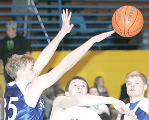 Libby’s senior guard Will Reichel has his shot tipped away by Jared Trinastich in first-quarter action vs. Columbia Falls Saturday evening.