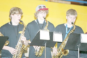 Pep Band saxaphone players Zac Rebo, left, Errik Westlund and Cody Barrick keep the crowd fired up Friday night during Libby's matchup with rival Troy. Two altos and a tenor.