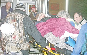 Meyers and friend Susan James were “horn hunting” on the south side of Highway 2 about seven miles west of Libby Saturday afternoon when his left foot slipped on slush, spinning him sideways and twisting his right leg. The fall fractured both the tibia and fibula in his lower right leg.
