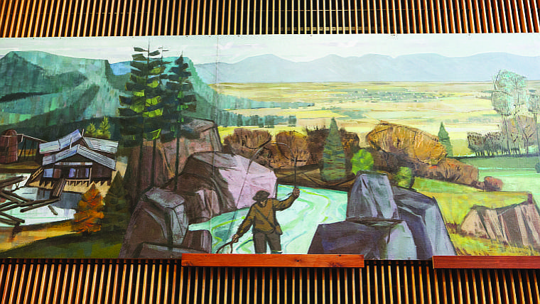 This mural, now hanging in the entrance of the Arts and Technology Building at Flathead Valley Community College, was painted by Kalispell artist Robert Huck and was recently moved from storage at the KM Building. (Patrick Cote/Daily Inter Lake)