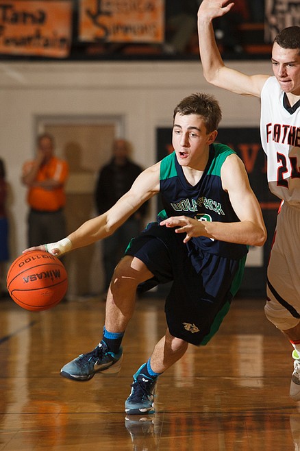 Glacier senior guard Charlie Obermiller (2) brings the ball up court Tuesday night during the crosstown matchup at Flathead High School. Tuesday, Jan. 29, 2013 in Kalispell, Montana. (Patrick Cote/Daily Inter Lake)