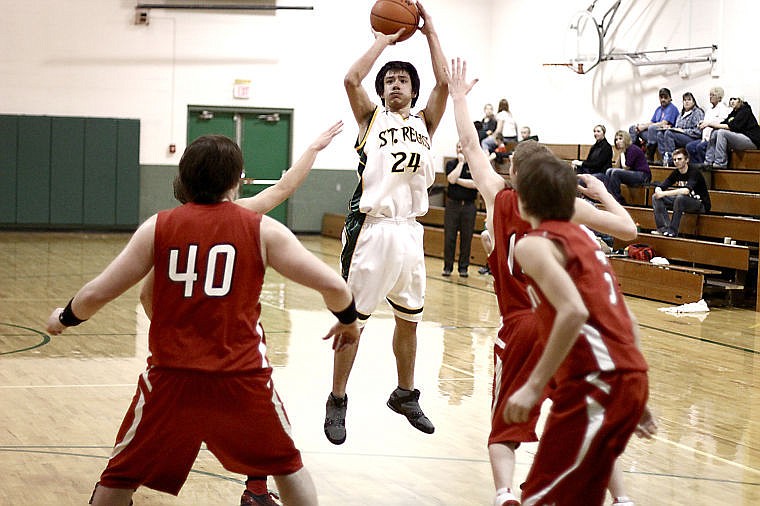 St. Regis sophomore Andrew Managhan elevates to hit a perimeter shot during Friday's home game.