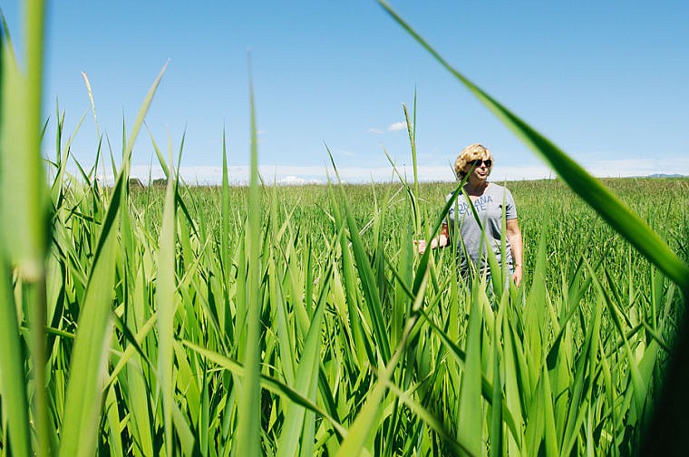 Extension Agent Pat McGlynn checks for noxious weeds Friday afternoon in a hayfield near Creston.