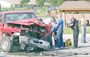 Wendell Dull, left, driver of the Dodge pickup, Officer John Powell, and driver of the Ford dump truck Barb White.