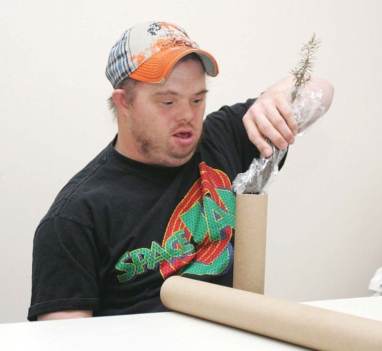 Joel Rogers of Northwest Tree co. places a white pine seedling inside a tube for shipping on June 28.