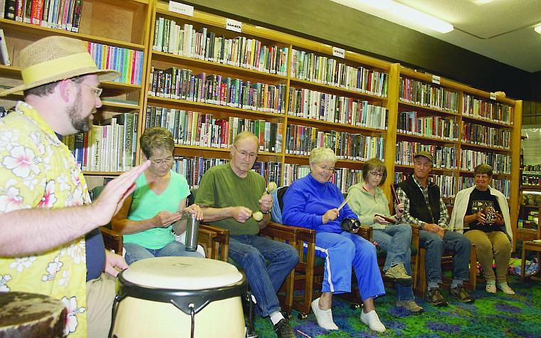 Grant Applehans teaches participants at the Plains Public Library how to play Afro-Caribbean instruments.
