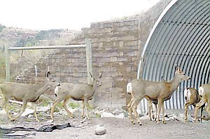 This undated photo provided by Montana Department of Transportation shows Mule Deer crossing through an animal passageway in Polson, Mont. In 2011, game cameras documented 22,466 animals moving through the passages, arcing over U.S. Highway 93 atop Evaro Hill. ThatÕs up from 12,022 critters in 2010. The tally included 25 species, grizzly bears, river otters, badgers, elk and bobcats among them. ÒOver four to six years, we expect to see increasing use,Ó said Marcel Huijser, a research ecologist from Montana State University whoÕs gathering data on the crossings. ÒAnimals get accustomed to them and start teaching their young. Then we should start seeing the numbers stabilize.Ó This year is the fifth since construction of the full wildlife crossing system finished. While the 56-mile stretch of highway doesnÕt have any knobs or levers to adjust its function, Huijser still has lots of analysis to finish and a couple of big questions to answer. (AP Photo/Montana Department of Transportation, Courtesy of CSKT, MDT & WTI-MSU)