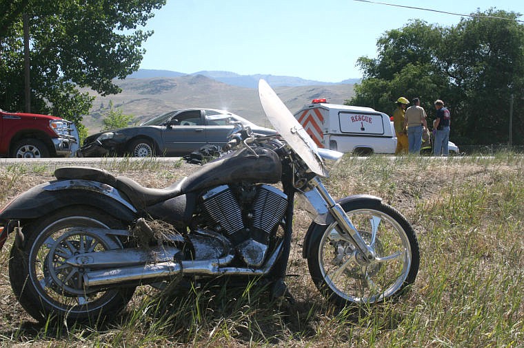 The motorcycle involved in a two-vehicle accident outside of Plains sits perched in front of the scene of the accident. Plains-Paradise Rural Fire Department responded to the accident.