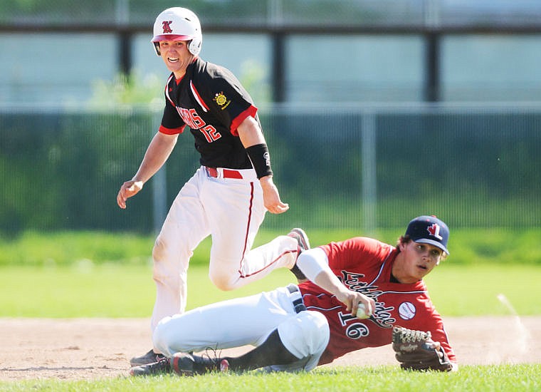 Kalispell's Adam Frandsen (12) runs to third base as the Lethbridge shortstop fields the ball Wednesday night during the Lakers' win over Lethbridge at Griffin Field. July 10, 2013 in Kalispell, Montana. (Patrick Cote/Daily Inter Lake)