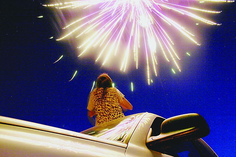 Shakira Brien enjoys the fireworks from the top of a truck at the Sanders County Fairgrounds. The public fireworks display began at 11 p.m. and lasted 30 minutes.