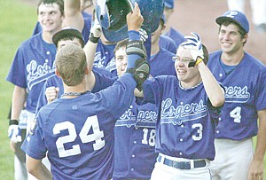 Jared Winslow is greeted by an outpouring of the Logger dugout after his 2 RBI homer in the bottom of the sixth vs. Kalispell A 7-9-13. (10-4)