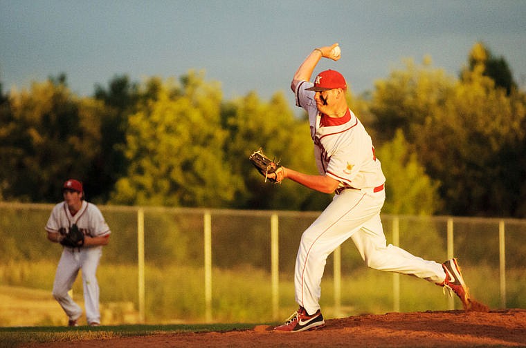 Kalispell Lakers Chandler Eaves pitches during Friday evening’s late game with Medicine Hat at Griffin Field in the John R. Harp American Legion baseball tournament. No score was available by press time.