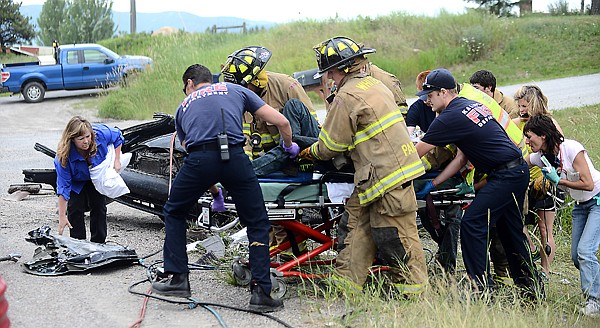 Members of the Whitefish and Kalispell Fire Departments work on the second person extracted from one of the vehicles involved in a head on collision on Highway 93 south of Whitefish, on July 12. (Brenda Ahearn/Daily Inter Lake)