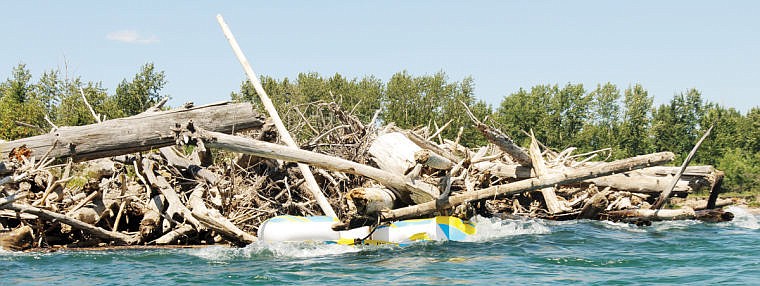 The logjam on the main stem of the Flathead River — upstream of an island just north of the Spruce Park On the River campground and the Montana 35 bridge — is about 50 feet wide and 15 feet thick.
